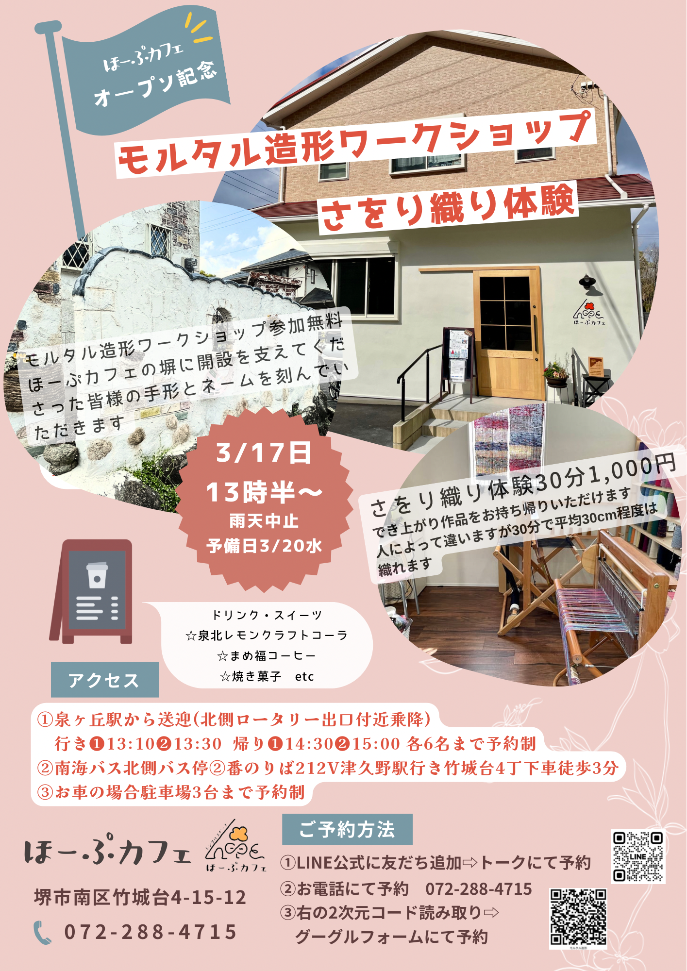 ほーぷカフェ オープン記念。モルタル造形ワークショップ 、さをり織り体験できるイベントを開催します。