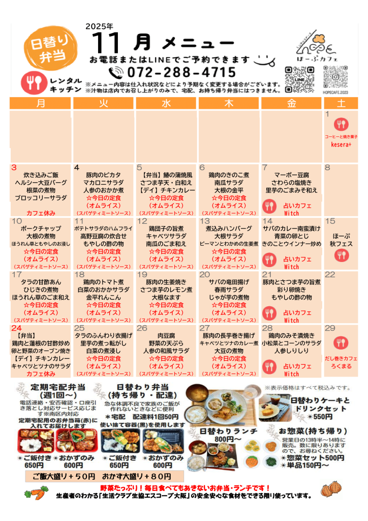 ほーぷカフェ「11月メニュー表」